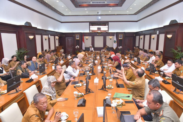 Sekda Jabar Herman Suryatman didampingi Kepala Biro Pengadaan Barang dan Jasa Aris Budiman pada Rapat Konsolidasi Percepatan Pengadaan Barang/Jasa yang di Gedung Sate Bandung, Senin (11/8/2025).
