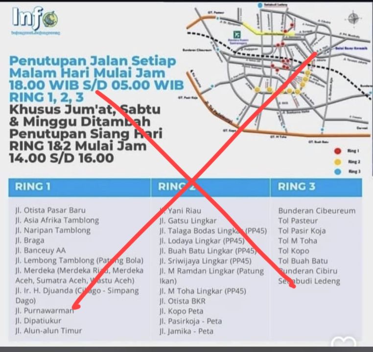 BANDUNG,- Baru-baru ini beredar informasi di media sosial yang menyebutkan adanya penutupan jalan besar-besaran di Kota Bandung. Mulai dari kawasan Ring 1 - Ring 3 seperti jalan protokol, Jalan Asia Afrika, Jalan Riau, dan jalan lainnya di Kota Bandung hingga pintu tol.