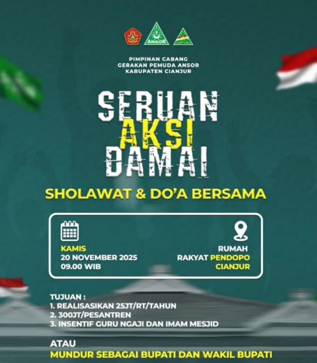 CIANJUR,- Hari ini (Kamis 20 November 2025) sejumlah elemen masyarakat Kab. Cianjur melakukan demo aksi damai bakal geruduk Pendopo Rakyat Cianjur. Aksi damai dimulai pukul 09.00 WIB.